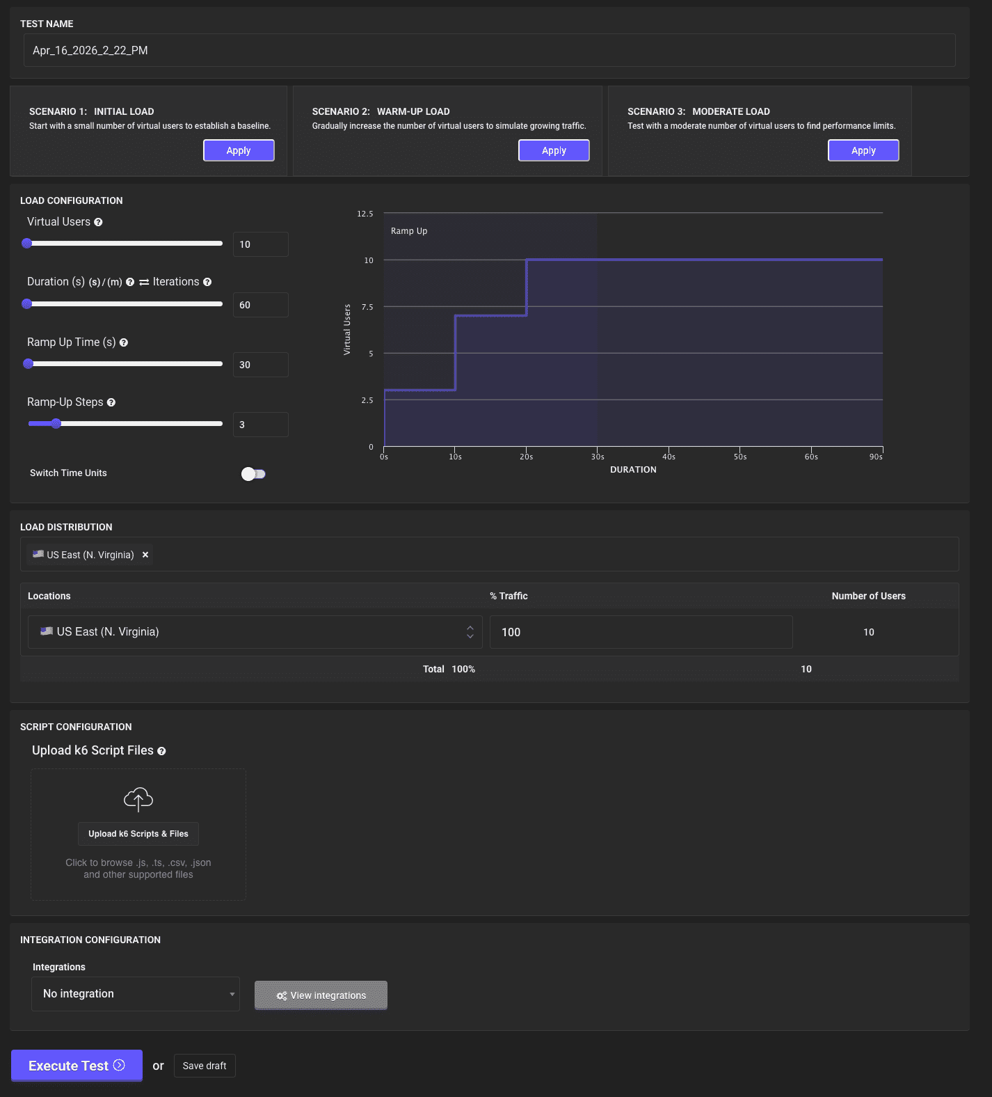 - Virtual Users — The number of concurrent virtual users to simulate (e.g., 10, 100, 1000+)