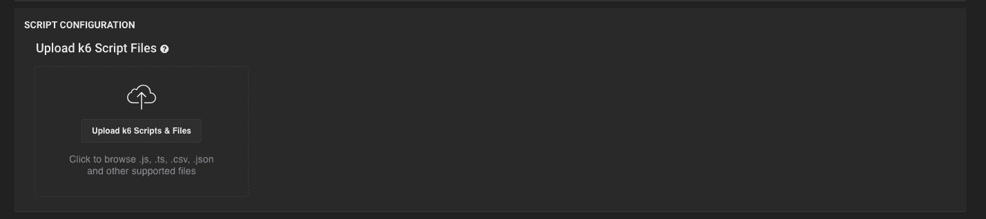 You can drag and drop files into the upload area or click the Upload k6 Scripts & Files button to browse.